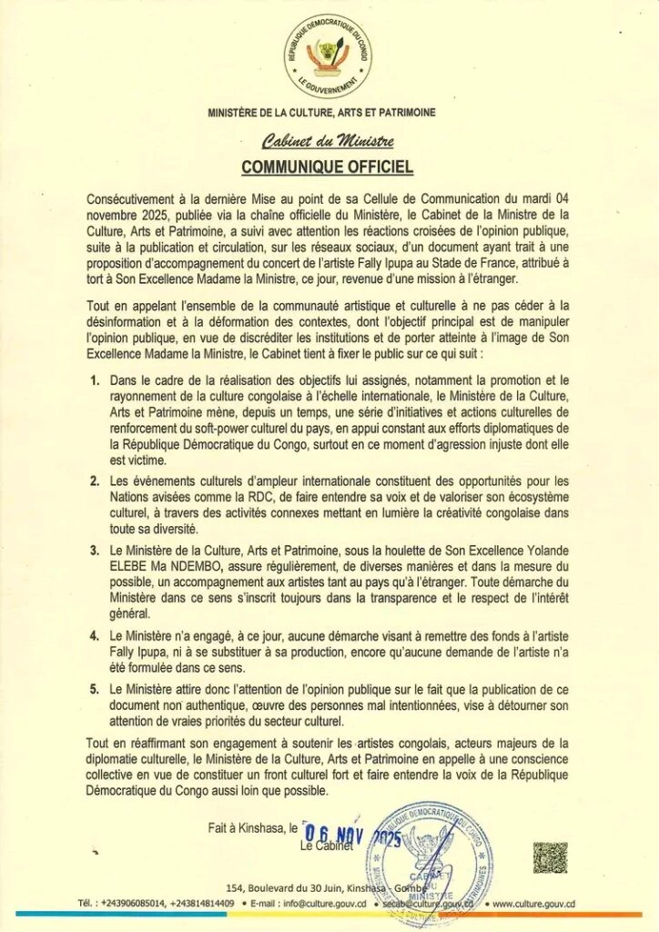 KINSHASA — Le Ministère de la Culture, des Arts et du Patrimoine a publié, ce jeudi 6 novembre 2025, un communiqué officiel afin de clarifier la polémique née sur les réseaux sociaux au sujet d’un document attribué à tort à la ministre Yolande Elebe Ma Ndembo. Ce texte, largement diffusé en ligne, évoquait une prétendue proposition d’accompagnement financier du concert de l’artiste Fally Ipupa au Stade de France.